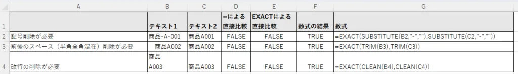 下記がEXACT関数の結果例と比較演算子の結果との対比です。