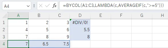 =BYCOL(A1:C3,LAMBDA(c,AVERAGEIF(c,">=5")))