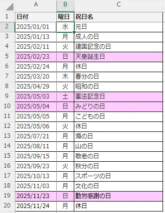 Excel 祝日一覧(毎年更新)