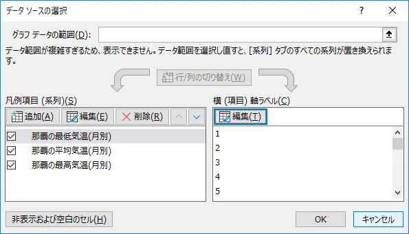 | 系列名 | 凡例に表示する文字列を指定します。 関数や数式を指定できないため 例では文字結合数式のセルを指定しています。 |