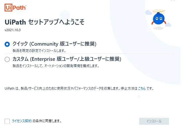 ダウンロードされたインストーラ(UiPathStudioCommunity.msi)を起動します。