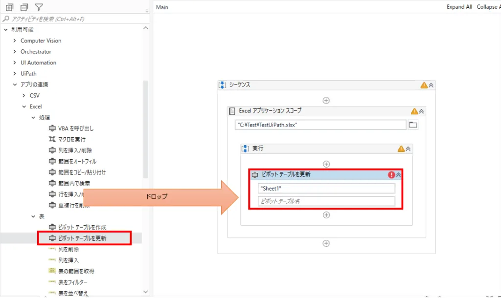 UiPath Excel ピボットテーブルを更新 アクティビティ
