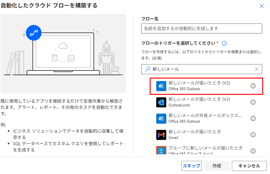 「自動化したクラウドフローの作成」画面が表示されたら、フロー名(管理用の名前)を入力します。分かりやすい名前を付けておくと、後から管理しやすくなります。