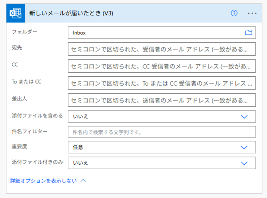 設定のポイント: 「件名」や「差出人フィルター」を設定することで、特定の条件に合致したメールのみでフローを起動できます。すべてのメールで起動すると処理が煩雑になるため、必要な条件を絞り込むことを推奨します。