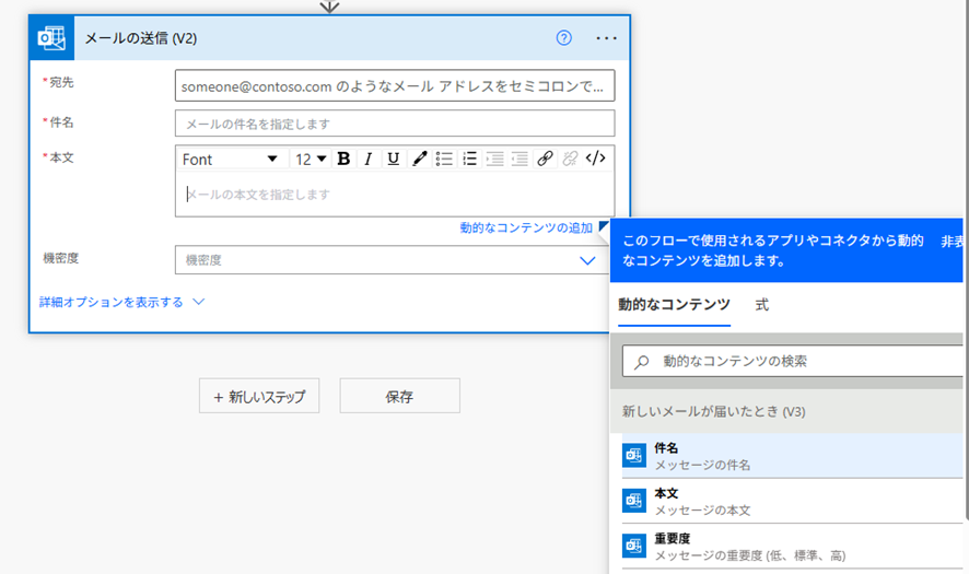 トリガーで取得した情報は「動的コンテンツ」として、後続のアクションで利用できます。メールトリガーの場合、以下のような情報が取得可能です。