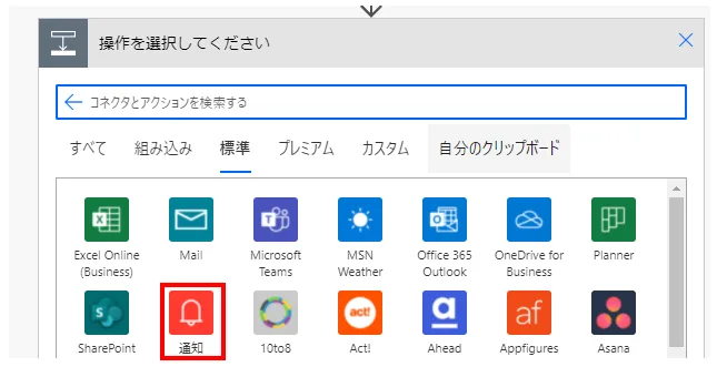 フローにステップを追加する際に「Notifications」コネクタを選択します。