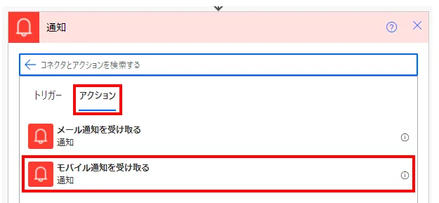 「アクション」より「モバイル通知を受け取る」を選択します。