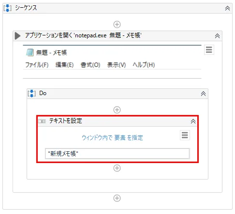 例えば「テキストを設定」を設置すると新規のメモ帳に指定のテキストが入力されます。