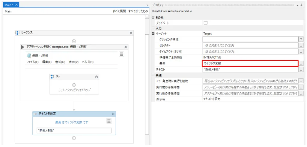 例えば「テキストを設定」の「入力」プロパティの「要素」に同じ変数を指定すると