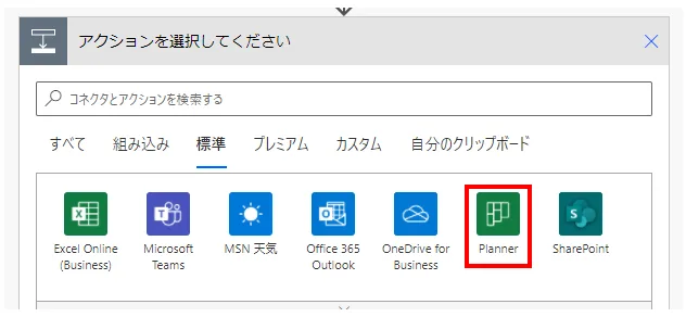 フローにステップを追加する際に「Planner」コネクタを選択します。
