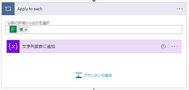 次に「Apply to each」を設置し以前の手順から出力の選択に