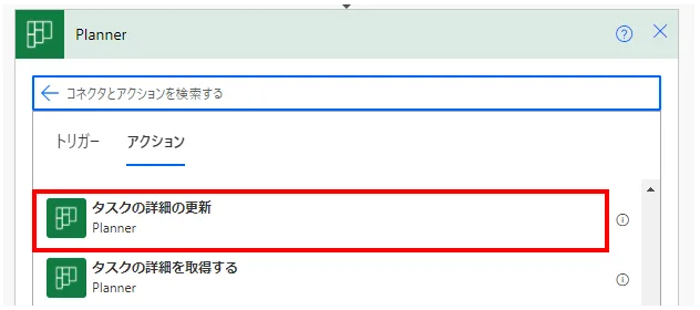 「タスクの詳細の更新(Planner)」は既存タスク