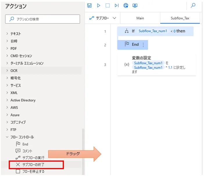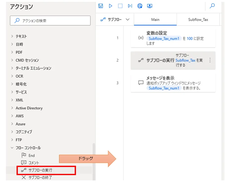 「アクション」の「フロー コントロール」より「サブフローの実行」をドラッグします。