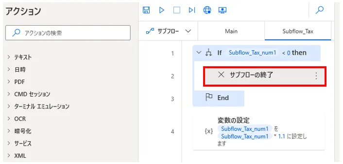 「サブフローの終了」はサブフローを中断するためのアクションです。
