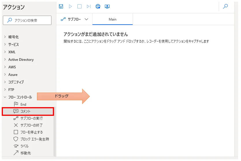 「フロー コントロール」の「コメント」をドラッグします。