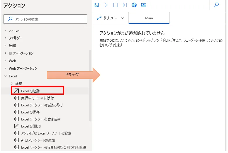 「アクション」の「Excel」より「Excelの起動」をドラッグします。
