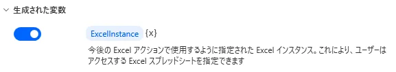 その後のアクションで開いたExcelブックを指定するための変数です。