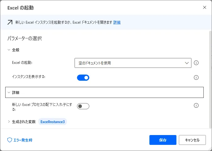 Power Automate Desktop 「Excelの起動」アクション