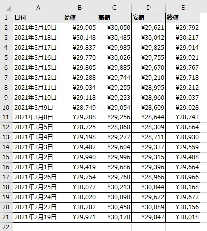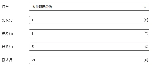 次のように指定するとA1~E21のセル範囲を値を取得します。