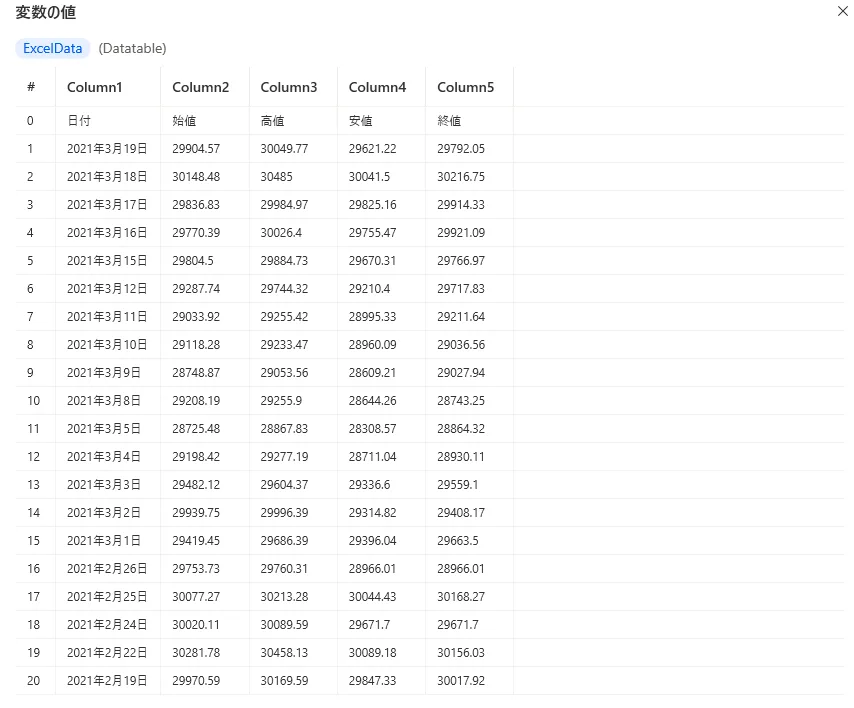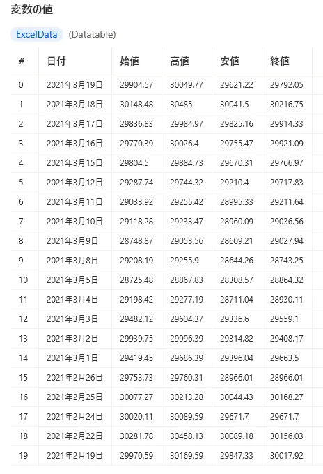 名前を付けているセル範囲の値をデータテーブルとして取得します。