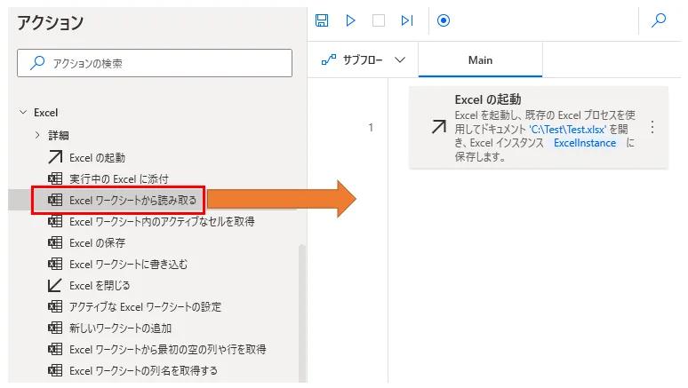 「アクション」の「Excel」より「Excel ワークシートから読み取る」をドラッグします。