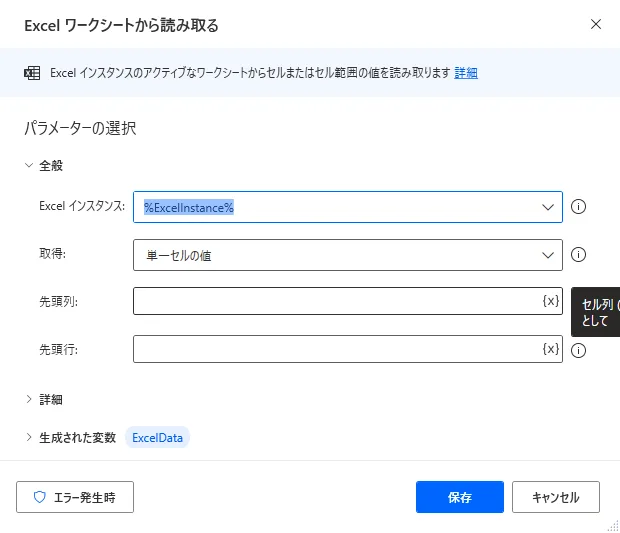 Power Automate Desktop 「Excel ワークシートから読み取る」アクション