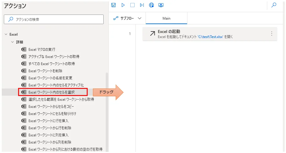 「Excel ワークシート内のセルを選択」をドラッグします。
