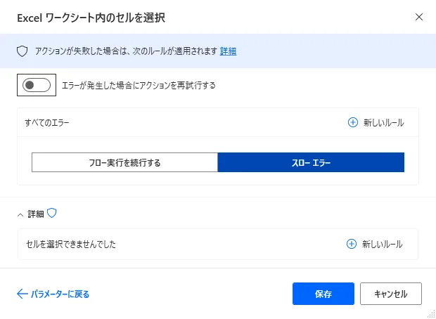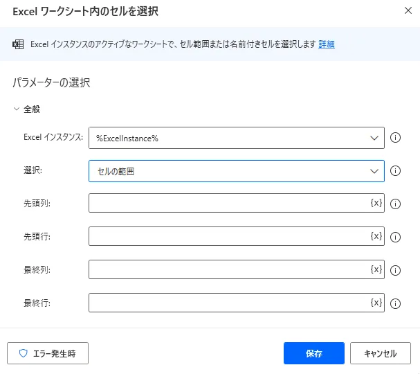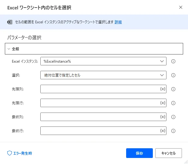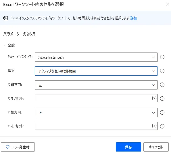 Power Automate Desktop 「Excel ワークシート内のセルを選択」アクション