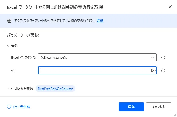 Power Automate Desktop 「Excel ワークシートから列における最初の空の行を取得」アクション