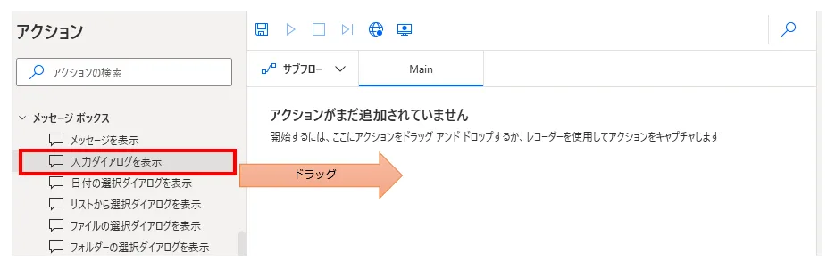「アクション」の「メッセージ ボックス」より「入力ダイアログを表示」をドラッグします。
