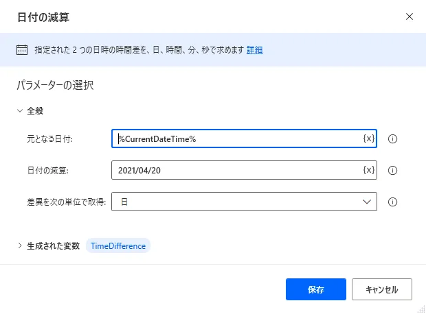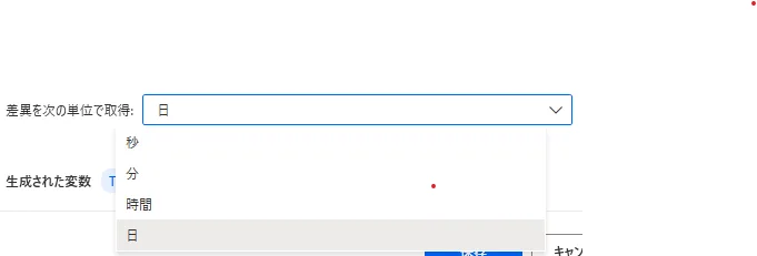 2つの日時の差を日、時間、分、秒の何れかの単位で取得するアクションです。