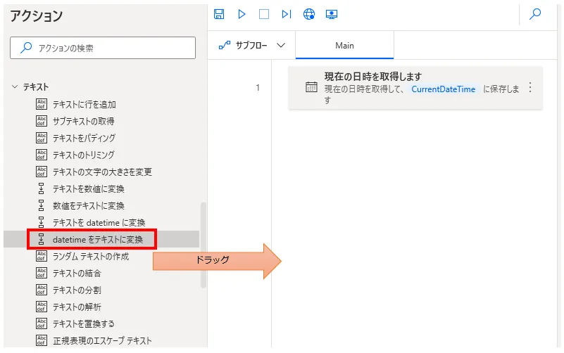 「テキスト」より「datetimeをテキストに変換」アクションを設置します。