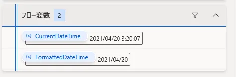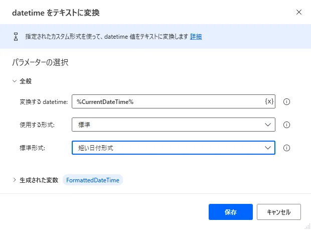 「datetimeをテキストに変換」アクションの結果(初期設定では変数名FormatterDateTime)に
