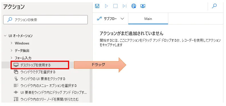 「アクション」の「UI オートメーション」より「デスクトップを使用する」をドラッグします。