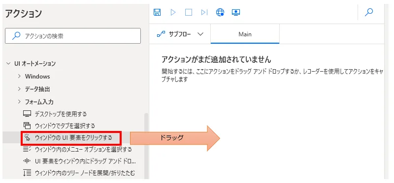 「アクション」の「UI オートメーション」より「ウインドウのUI要素をクリックする」をドラッグします。