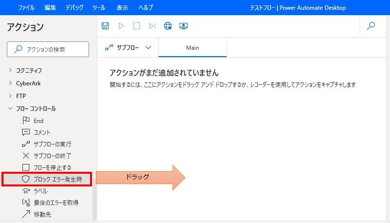 「アクション」の「フロー コントロール」より、「ブロック エラー発生時」をドラッグします。