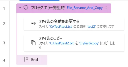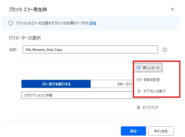 | ブロックの末尾に移動する | 発生したアクションと途中のアクションを無視して 「ブロック エラー発生時」のEndブロックまで移動します。 |