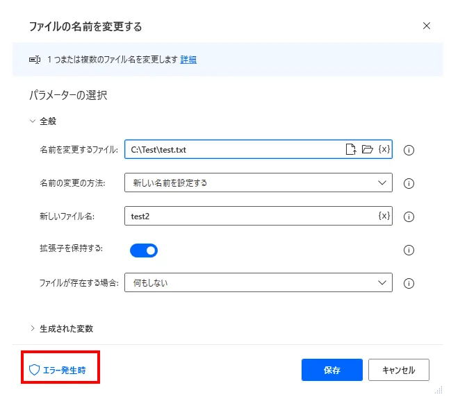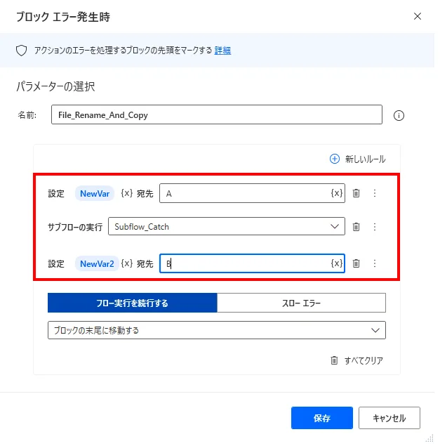 「ブロック エラー発生時」に設定したエラー(例外)処理は