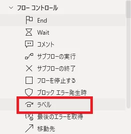 | ラベルの移動 | 任意の「ラベル」の位置に移動します。![]() ![]() 「ラベル」は「フローコントロール」の中から設置します。 ![]() ![]() しかし、複数の「ラベル」に移動してしまうフローは非常に難解で非推奨です。 利用するのであれば、フローの最後だけにラベルを設置するようにしましょう。 |