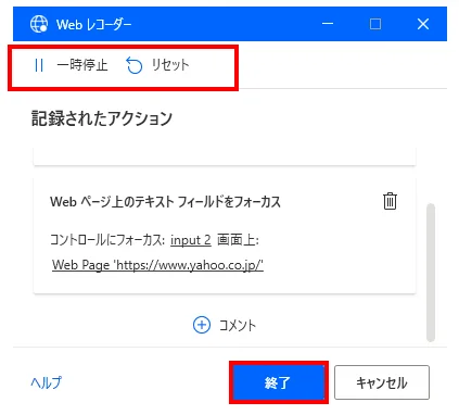 もし記録したくない操作を挟む時は「一時停止」、
