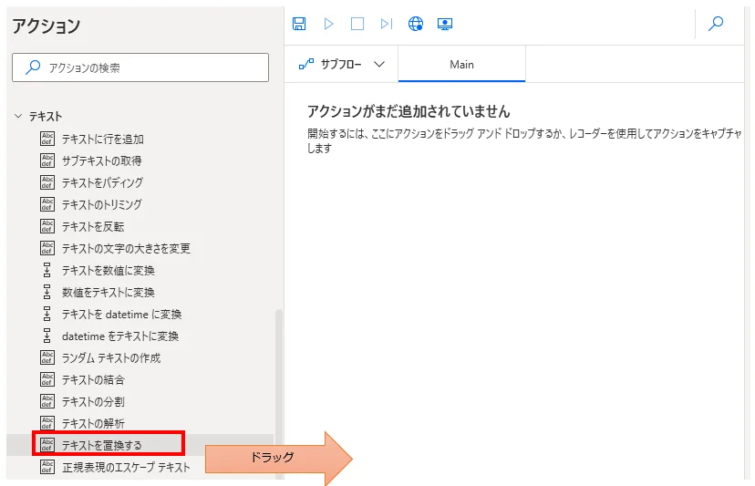 「アクション」の「テキスト」より、「テキストの置換」をドラッグします。