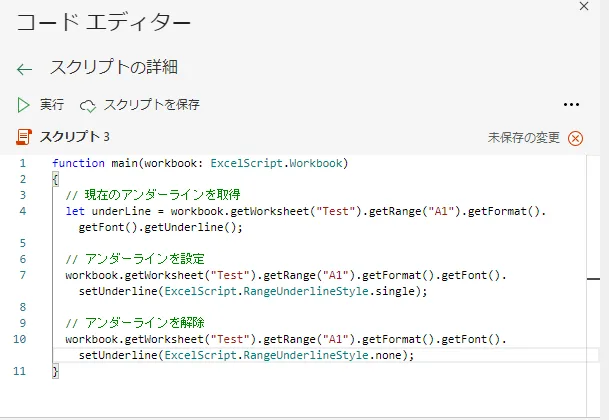 let underLine = workbook.getWorksheet("シート").getRange("セルアドレス").getFormat().getFont().getUnderline();