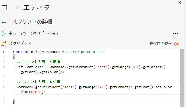 let fontColor = workbook.getWorksheet("シート").getRange("セルアドレス").getFormat().getFont().getColor();