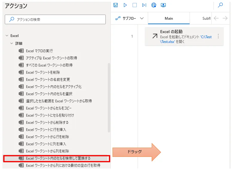 「Excel ワークシート内のセルを検索して置換する」をドラッグします。