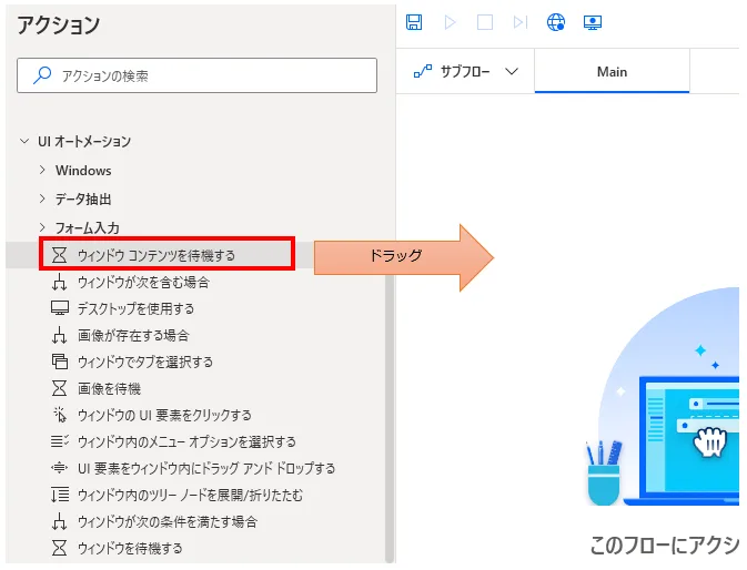 「アクション」の「UI オートメーション」より「ウィンドウ コンテンツを待機する」をドラッグします。
