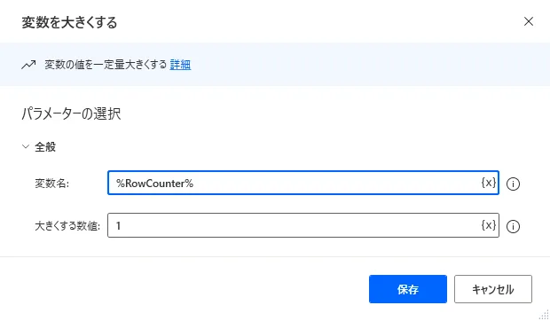 続いて「For each」の中に「変数を大きくする」を設置してRowCounterを1ずつカウントアップします。