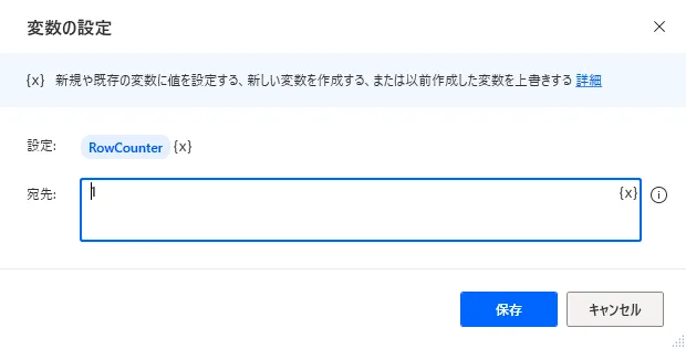 「変数の設定」を設置してRowCounterを作成し、初期値を1に設定します。