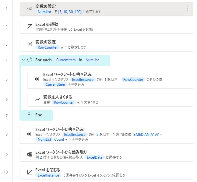 生成された変数(初期設定では変数名ExcelData)に中央値が格納されます。
