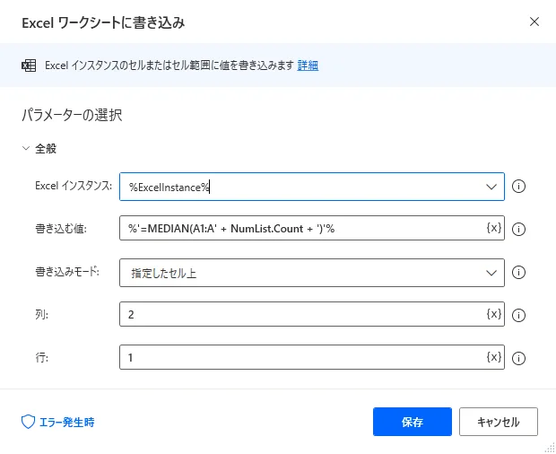 | 書き込む値 | %'=MEDIAN(A1:A' + NumList.Count + ')'% |