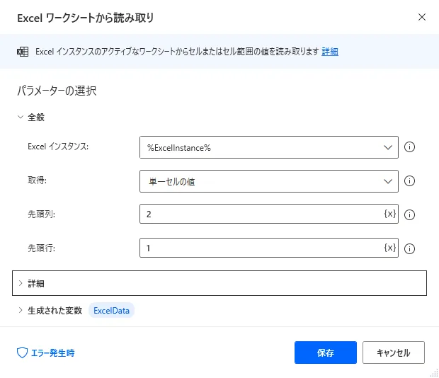 この数式の結果を「Excel ワークシートから読み取り」で取得すると